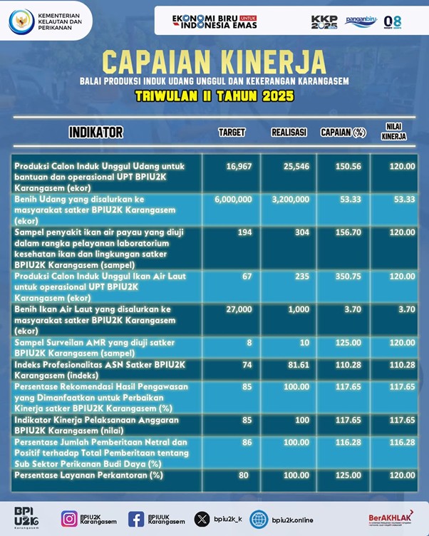 Karangasem – Balai Produksi Induk Udang Unggul dan Kekerangan (BPIU2K) Karangasem mencatat capaian kinerja yang positif pada Triwulan II Tahun 2025. Berdasarkan laporan kinerja terbaru, sebagian besar indikator utama menunjukkan hasil yang melampaui target yang telah ditetapkan.
