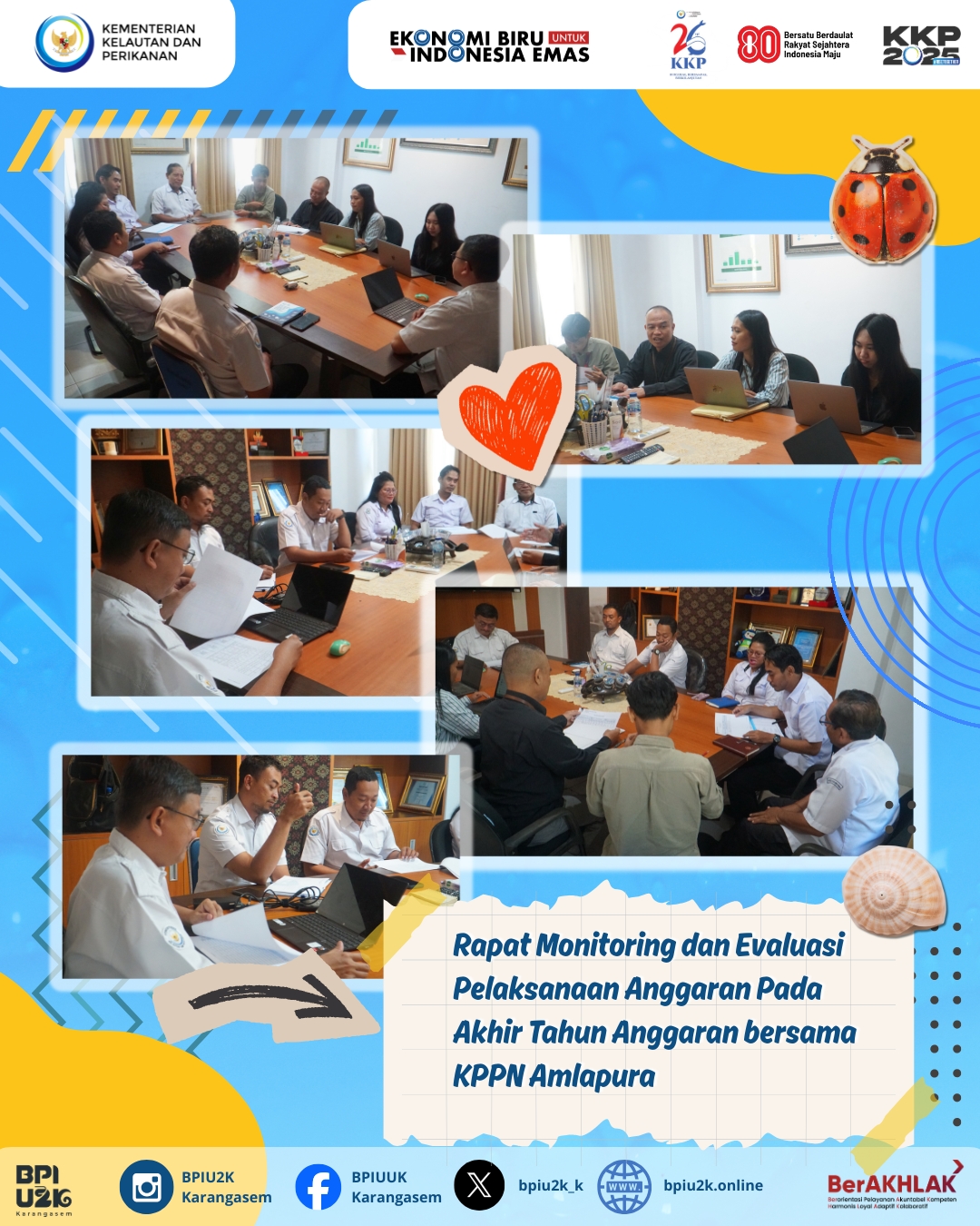 Karangasem, 12 NOVEMBER 2025 – Balai Produksi Induk Udang dan Kekerangan (BPIU2K) Karangasem melaksanakan Rapat Monitoring dan Evaluasi (Monev) Pelaksanaan Anggaran Akhir Tahun Anggaran bersama Kantor Pelayanan Perbendaharaan Negara (KPPN) Amlapura.