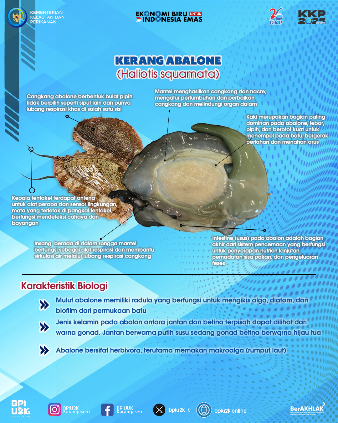 Dalam infografis tersebut dijelaskan bahwa kerang abalone memiliki bentuk cangkang bulat pipih, tidak berpilin seperti siput pada umumnya, serta dilengkapi lubang respirasi khas di salah satu sisi cangkang. Mantel abalone berfungsi menghasilkan cangkang dan lapisan nacre, sekaligus mengatur pertumbuhan serta melindungi organ-organ dalam tubuh.