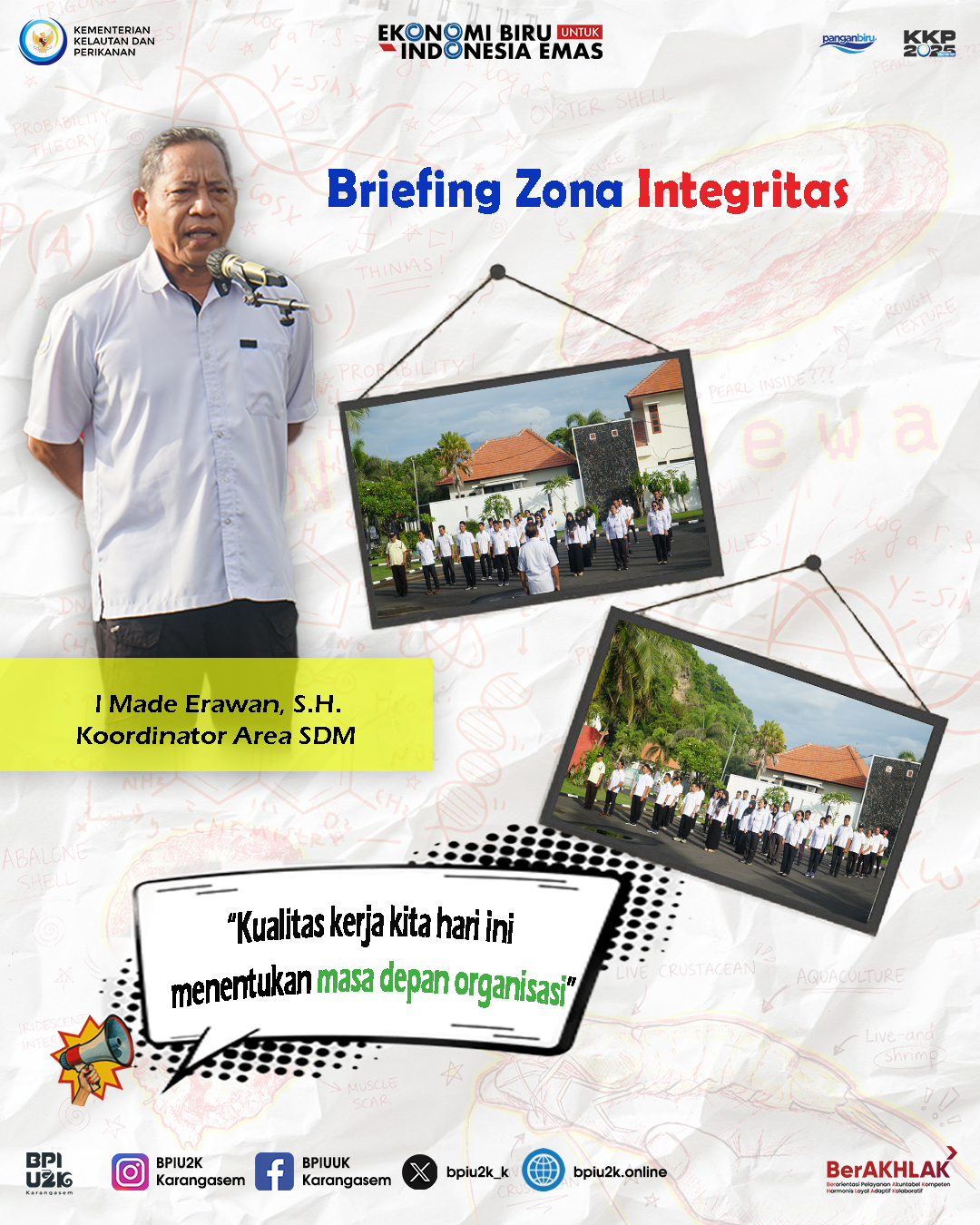 Balai Produksi Induk Udang Unggul dan Kekerangan (BPIU2K) Karangasem melaksanakan kegiatan Briefing Zona Integritas sebagai bagian dari upaya penguatan budaya kerja yang profesional, berintegritas, dan berorientasi pada pelayanan publik. Kegiatan ini diikuti oleh seluruh pegawai dan dilaksanakan di lingkungan kantor BPIU2K Karangasem.