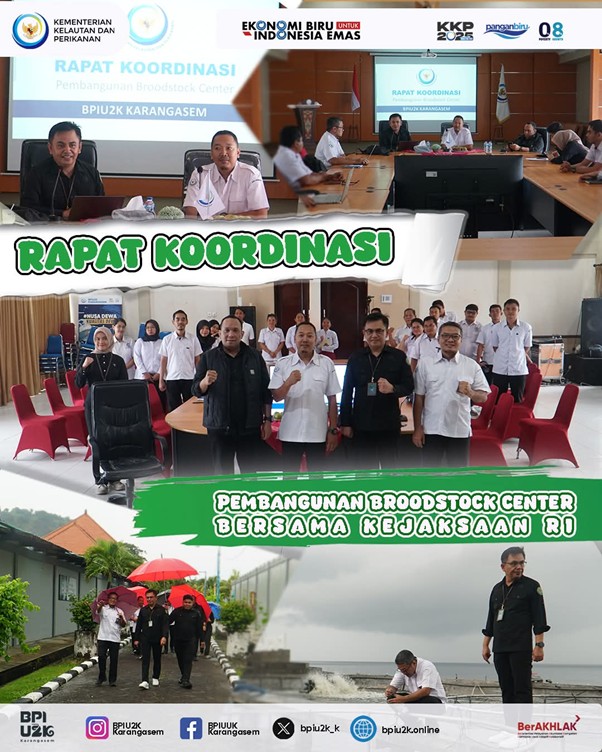 Karangasem, Bali — Balai Produksi Induk Udang Unggul dan Kekerangan (BPIU2K) Karangasem, di bawah naungan Kementerian Kelautan dan Perikanan (KKP), melaksanakan Rapat Koordinasi Pembangunan Broodstock Center bersama Kejaksaan Republik Indonesia (RI). Kegiatan ini dilaksanakan dalam rangka memperkuat sinergi antar lembaga untuk mendukung pembangunan sektor kelautan dan perikanan yang berintegritas dan berkelanjutan.