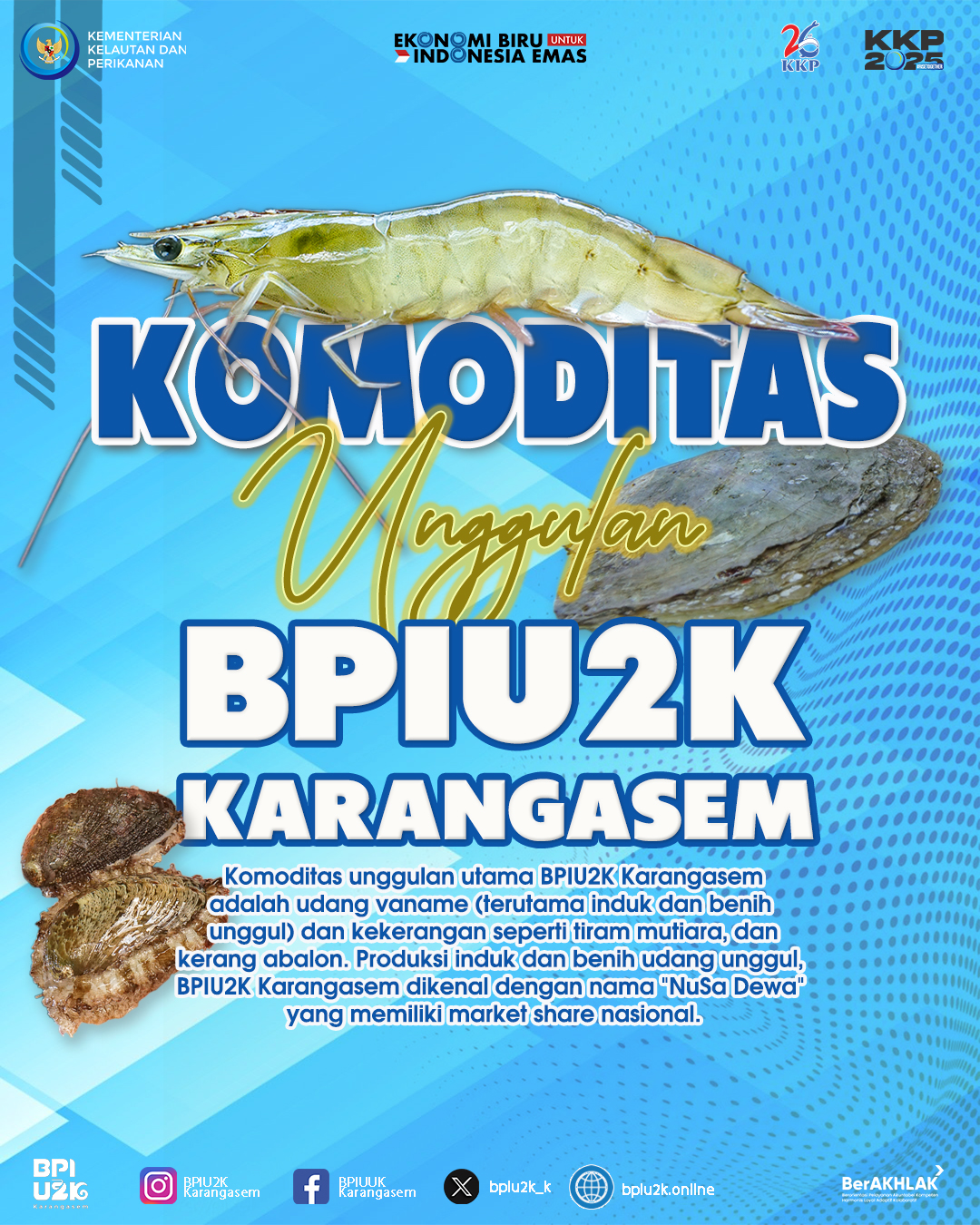 Balai Produksi Induk Udang Unggul dan Kekerangan (BPIU2K) Karangasem terus memperkuat perannya sebagai salah satu unit pelaksana teknis Kementerian Kelautan dan Perikanan (KKP) dalam pengembangan komoditas perikanan unggulan yang berdaya saing nasional. Hal ini ditunjukkan melalui fokus pengembangan komoditas utama berupa udang vaname serta berbagai jenis kekerangan bernilai ekonomi tinggi.