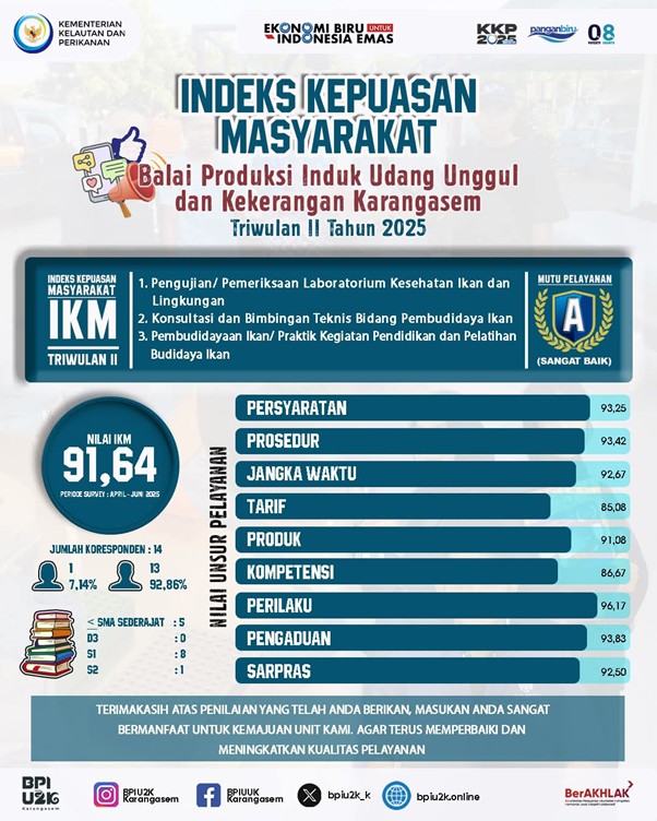Karangasem – Balai Produksi Induk Udang Unggul dan Kekerangan (BPIU2K) Karangasem kembali menunjukkan kinerja pelayanan publik yang memuaskan. Berdasarkan hasil survei Indeks Kepuasan Masyarakat (IKM) Triwulan II Tahun 2025, BPIU2K Karangasem mencatat nilai 91,64 dengan kategori “Sangat Baik”.