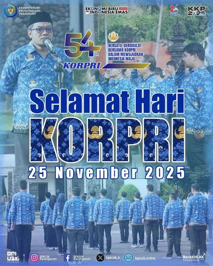 Karangasem, 25 November 2025 – Pegawai di lingkungan Balai Pelaksana Infrastruktur Urusan Kelautan dan Perikanan (BPIU2K) Karangasem mengikuti upacara peringatan Hari Korps Pegawai Republik Indonesia (KORPRI) ke-54 yang berlangsung khidmat pada Selasa pagi.