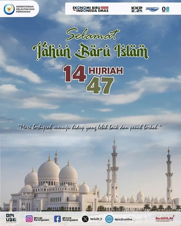 Karangasem, Bali — Balai Produksi Induk Udang Unggul dan Kekerangan (BPIU2K) Karangasem turut menyemarakkan peringatan Tahun Baru Islam 1447 Hijriah dengan menyampaikan ucapan selamat dan ajakan untuk berhijrah menuju kehidupan yang lebih baik dan penuh berkah.