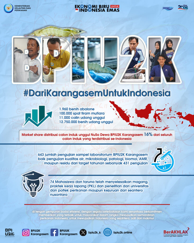 Keterbatasan anggaran tidak menyurutkan semangat BPIU2K Karangasem dalam memberikan pelayanan yang terbaik untuk masyarakat. Pencapaian impresif ditunjukkan BPIU2K Karangasem selama tahun 2025 dengan telah mendistribusikan 1.960 benih abalone, 100.000 spat tiram mutiara, 12.750.000 bantuan benih udang unggul dan 11.000 bantuan calon induk udang unggul. Market share bantuan calon induk udang unggul BPIU2K Karangasem sebesar 16% dari seluruh calon induk yang terdistribusi se-Indonesia.