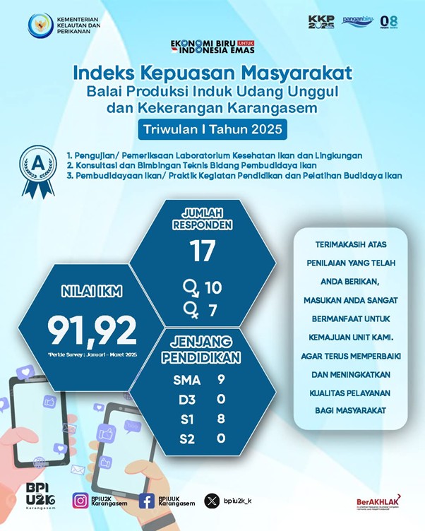Karangasem, 27 Oktober 2025 — Balai Produksi Induk Udang Unggul dan Kekerangan (BPIUUK) Karangasem, di bawah naungan Kementerian Kelautan dan Perikanan (KKP), kembali mencatat prestasi membanggakan dengan memperoleh nilai Indeks Kepuasan Masyarakat (IKM) sebesar 91,92 pada Triwulan I Tahun 2025. Nilai tersebut menempatkan BPIUUK Karangasem dalam kategori “A” (Sangat Baik).
