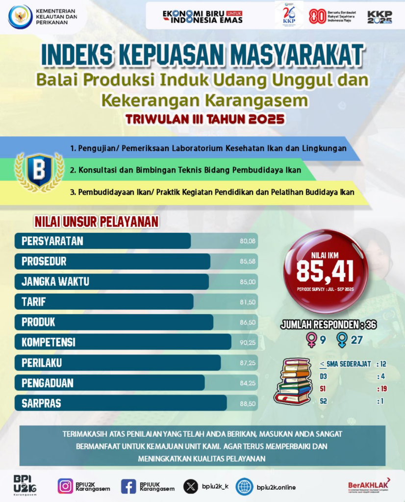 Melalui hasil SKM ini, kami juga mengucapkan terima kasih kepada masyarakat yang telah memberikan masukan berharga. Kritik dan saran Anda menjadi motivasi bagi kami untuk terus berinovasi demi menciptakan pelayanan publik yang unggul dan berdaya saing. Kami berharap, ke depannya BPIU2K Karangasem dapat memberikan kontribusi yang lebih besar dalam mendukung kesejahteraan masyarakat dan pengembangan sektor kelautan dan perikanan di Indonesia.
