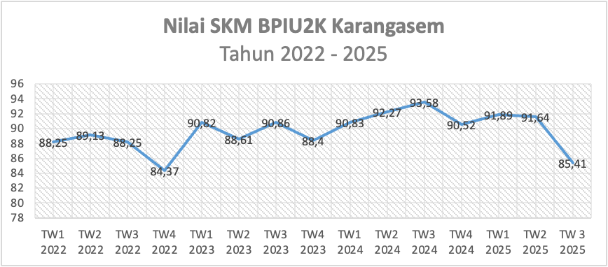 Berdasarkan hasil Survei Kepuasan Masyarakat (SKM) Triwulan III tahun 2025, pelaksanaan pelayanan publik di BPIU2K Karangasem menunjukkan hasil yang sangat membanggakan. Secara umum, tingkat kualitas pelayanan mendapatkan predikat  Baik, dengan nilai SKM sebesar 85,41. Capaian ini sekaligus mencerminkan adanya tren peningkatan kinerja pelayanan publik yang konsisten sejak tahun 2022 hingga 2025.