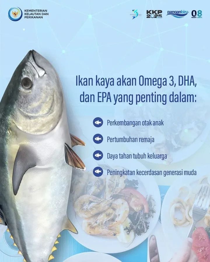 Kementerian Kelautan dan Perikanan (KKP) kembali mengajak masyarakat untuk meningkatkan konsumsi ikan sebagai sumber protein dan nutrisi utama yang sangat bermanfaat bagi pertumbuhan dan kesehatan. Dalam materi edukasi yang ditampilkan, KKP menyoroti kandungan penting pada ikan seperti Omega 3, DHA, dan EPA, yang berperan besar dalam mendukung kualitas kesehatan keluarga Indonesia.