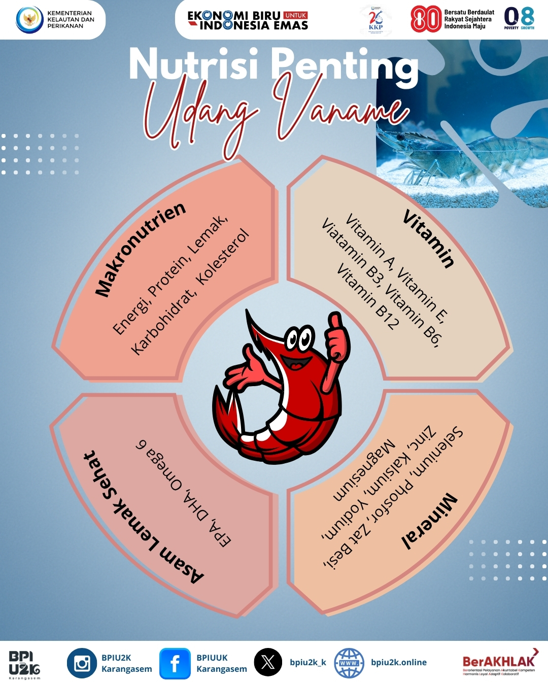 Udang vaname tidak hanya dikenal sebagai komoditas unggulan perikanan Indonesia, tetapi juga sebagai sumber pangan bergizi tinggi yang memiliki banyak manfaat bagi kesehatan tubuh. Melalui infografis “Nutrisi Penting Udang Vaname”, Kementerian Kelautan dan Perikanan (KKP) mengajak masyarakat untuk lebih mengenal kandungan gizi luar biasa dari udang yang menjadi andalan program Ekonomi Biru untuk Indonesia Emas ini.