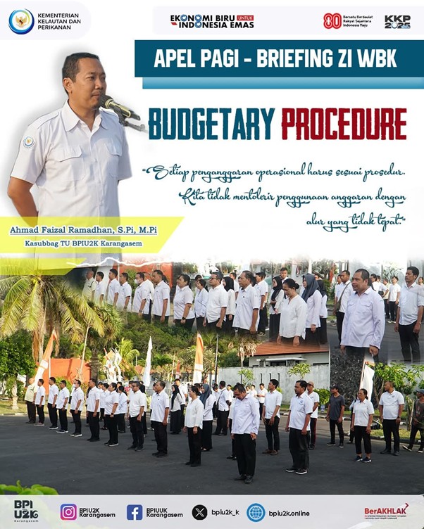 Karangasem, 17 Oktober 2025 — Balai Produksi dan Induk Udang Unggul dan Kekerangan (BPIU2K) Karangasem menggelar apel pagi dan briefing Zona Integritas Wilayah Bebas dari Korupsi (ZI WBK) dengan tema “Budgetary Procedure” di halaman kantor BPIU2K Karangasem, Jumat (17/10).