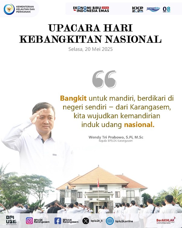 Upacara ini menjadi momentum penting untuk memperkuat komitmen seluruh pegawai BPIU2K Karangasem dalam mendukung program Ekonomi Biru untuk Indonesia Emas 2045 yang digagas oleh Kementerian Kelautan dan Perikanan (KKP). Melalui semangat kebangkitan nasional, BPIU2K Karangasem terus berupaya meningkatkan produksi dan inovasi dalam penyediaan induk udang unggul guna mewujudkan kemandirian perbenihan nasional.