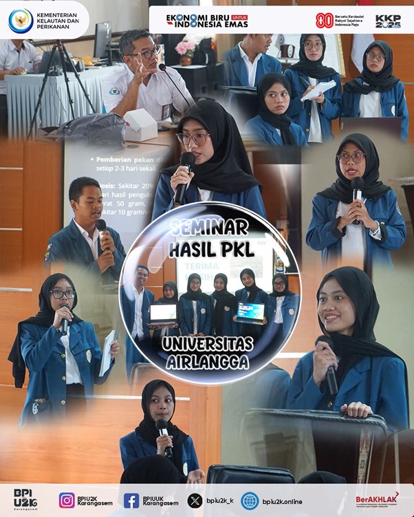 Karangasem, 16 Oktober 2025 — Balai Produksi Induk Udang Unggul dan Kekerangan (BPIU2K) Karangasem menerima kunjungan akademik dari Taruna Politeknik Kelautan dan Perikanan (Poltek KP) Sidoarjo dalam rangka pelaksanaan kegiatan Seminar Hasil Praktik Kerja Lapang (PKL).